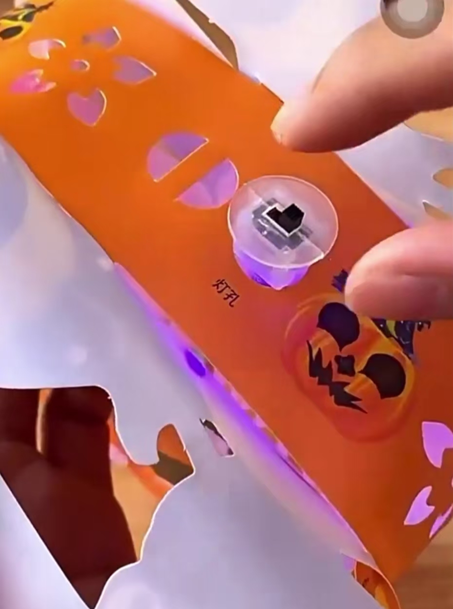 Next, we need to find the hole in the pumpkin body designed for the LED lights. This hole is usually located inside the pumpkin, ensuring the LED lights can be safely placed. Insert the LED lights into the hole, turn on the power, and you will see the light shining through the hollow eyes and mouth, creating a terrifying yet charming atmosphere. At this point, your Halloween gift is almost complete.