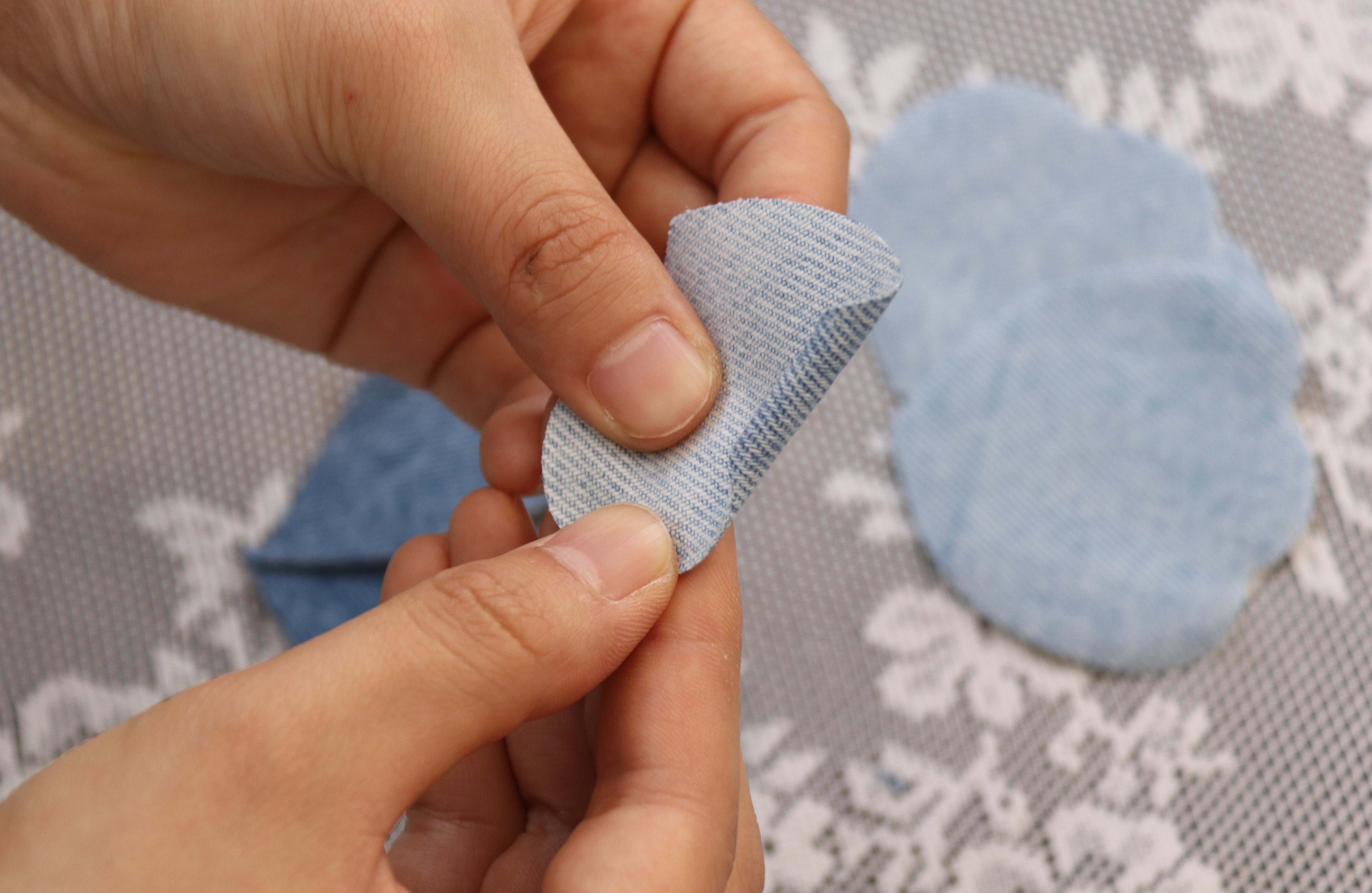 - To give the petals a natural look, gently scrape the edges of the denim petals with your fingernail or the edge of the scissors, making them slightly curled and frayed.