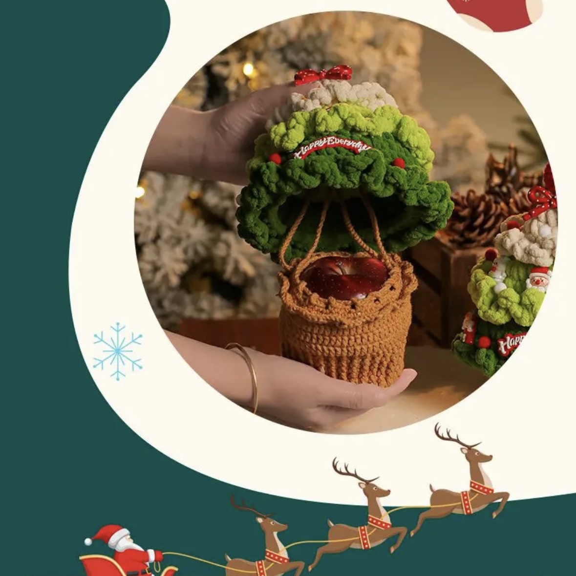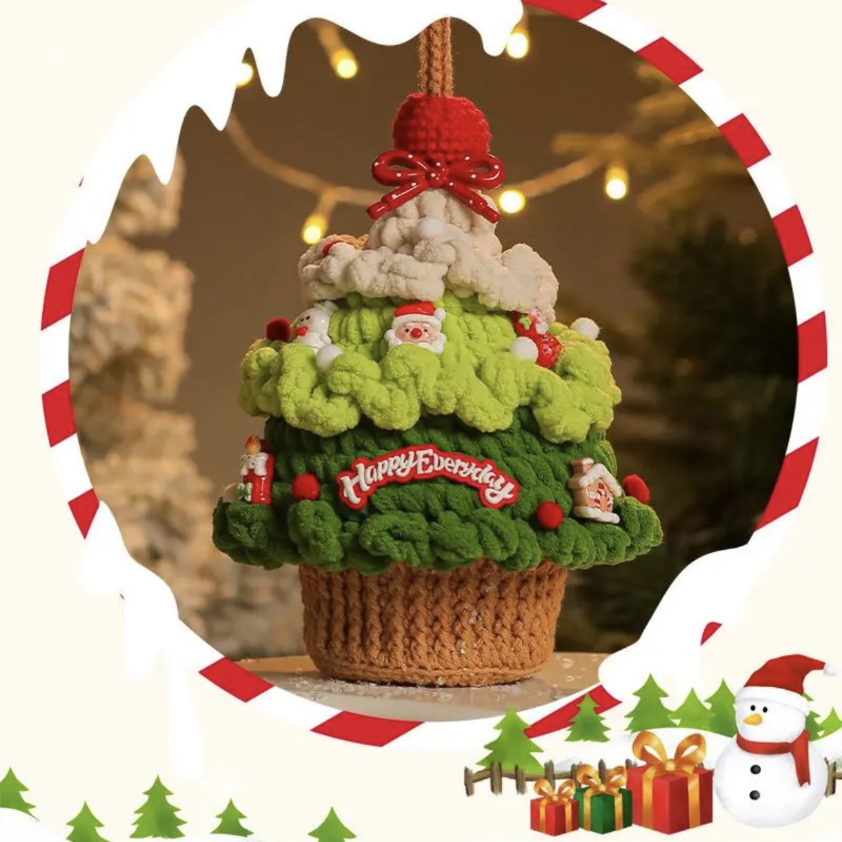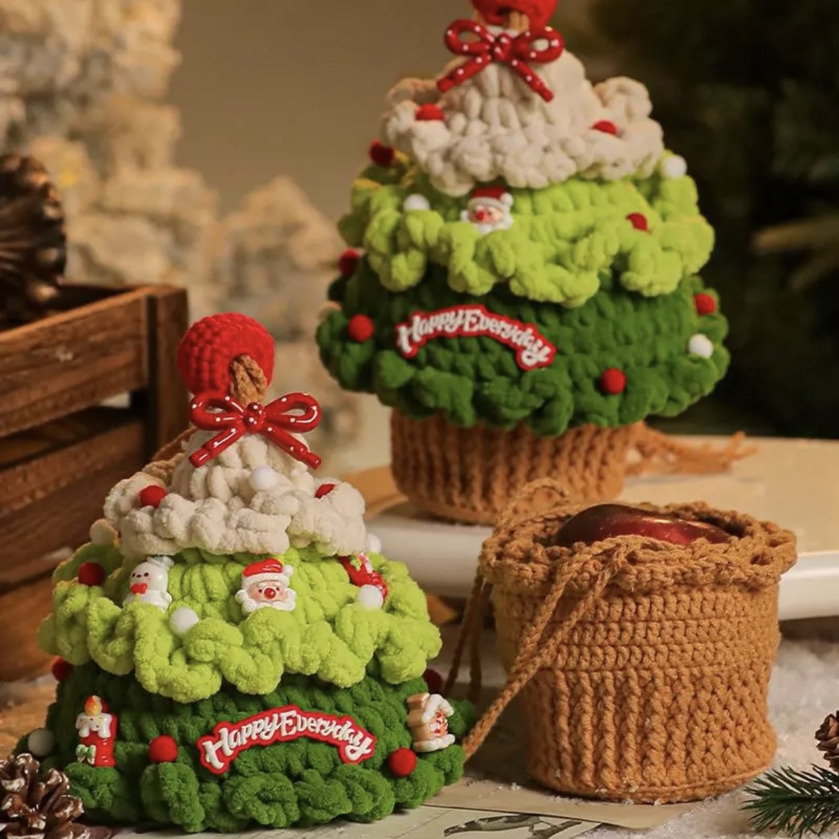 ✨Crafted with soft, fluffy yarn, each piece is a unique handmade gift—adorned with cute Santa claus charms, tiny house decor, and a cheerful “Happy Everyday” banner, making it a gorgeous decorative accessory for your holiday space. The detachable tree top reveals a cozy basket ideal for stashing apples, candies, or small treats – practical and playful!🎄