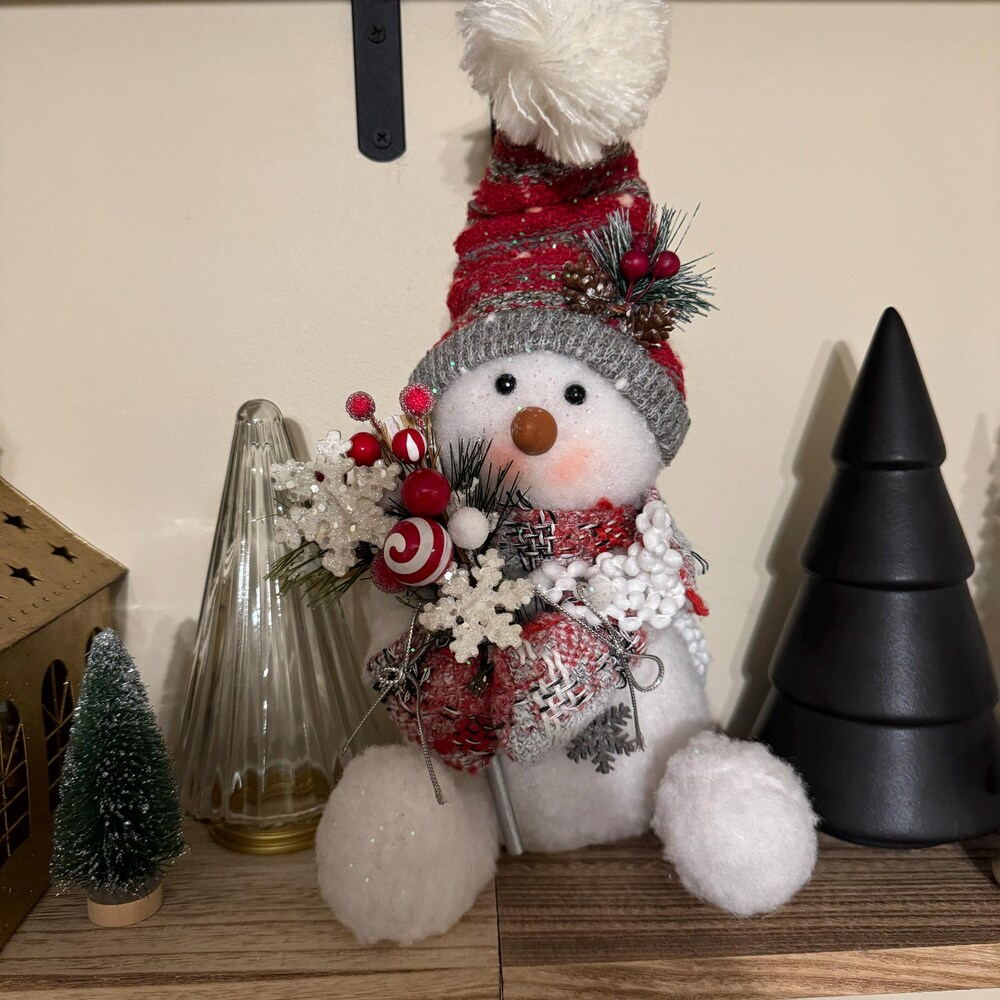 Red Hat Snowman Plush Handmade Doll 13 Inch Seated Family Christmas Decor